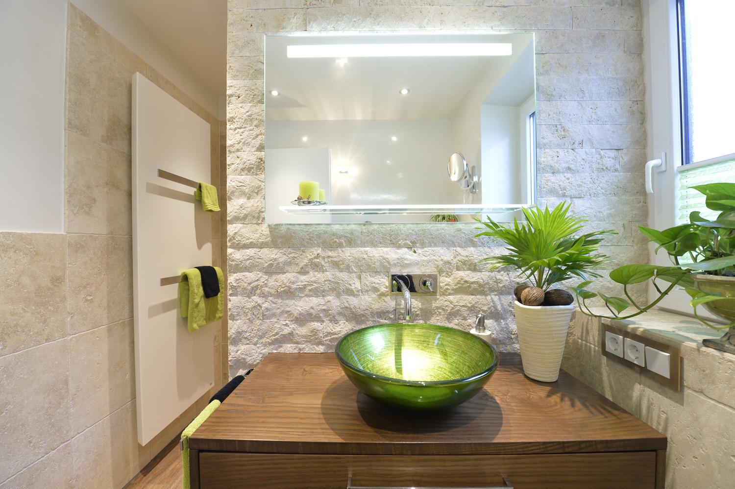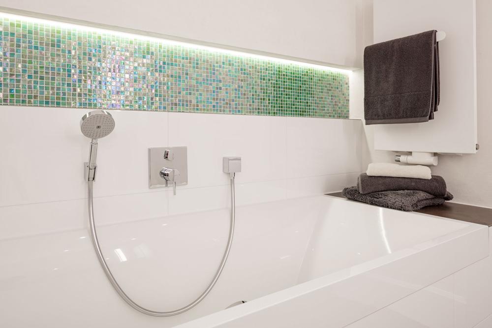 Das moderne Bad mit Badewanne überzeugt in seiner klaren Design-Linie mit eckigen Formen. Natursteinfliesen und die moderne Wandgestaltung aus grünen Glasmosaikfliesen verleihen diesem modernen Bad sein natürliches und freundliches Ambiente. Die perfekt inszenierte direkte und indirekte Beleuchtung sowie die sorgfältig ausgewählte, stilvolle Dekoration sorgen für den letzten Schliff.