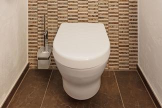 Die moderne Gäste-Toilette ergänzt unsere Planung um ein drittes Badezimmer, das sich nahtlos in die Designreihe der beiden anderen einfügt. Denn auch das kleine Gäste-WC überzeugt in seinem rustikal und zugleich modernen Stil: In dieser gemütlichen, aber eleganten Atmosphäre können sich die Besucher der Bauherrin wie zuhause fühlen.