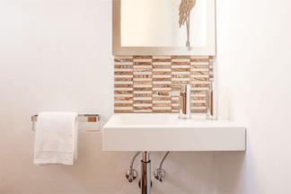 Neben einem Gäste-WC planten und implementierten wir auch die neue Dusche mit Mosaikfliesen aus Naturstein und passend dazu das Bad mit Badewanne. So konnte der Wunsch der Bauherrin nach modernem Stil mit naturnaher Atmosphäre trotz unterschiedlicher Gestaltungselemente in allen drei Räumen erfüllt werden.